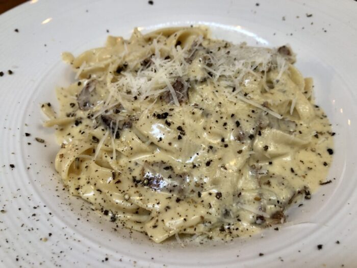 で、3分の1くらい食べたところで、固めのフェットチーネがだんだんきつくなってきた。おいしいんだよ、おいしいんだけどね・・なんかきちぃ。