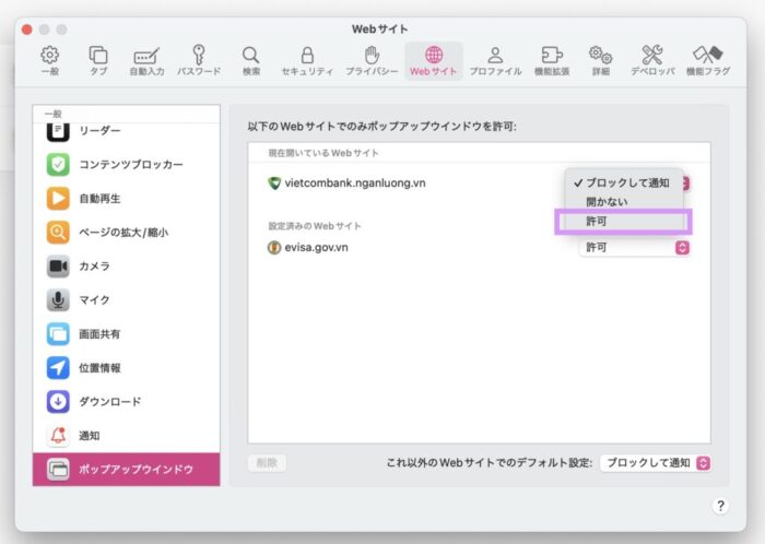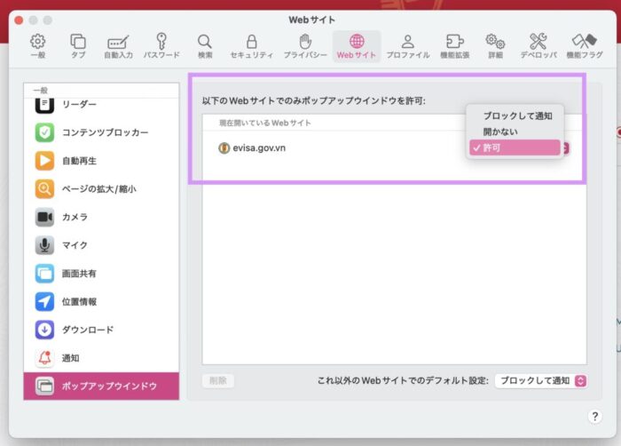 #ポップアップウインドウ → WEBサイト → evisaを許可